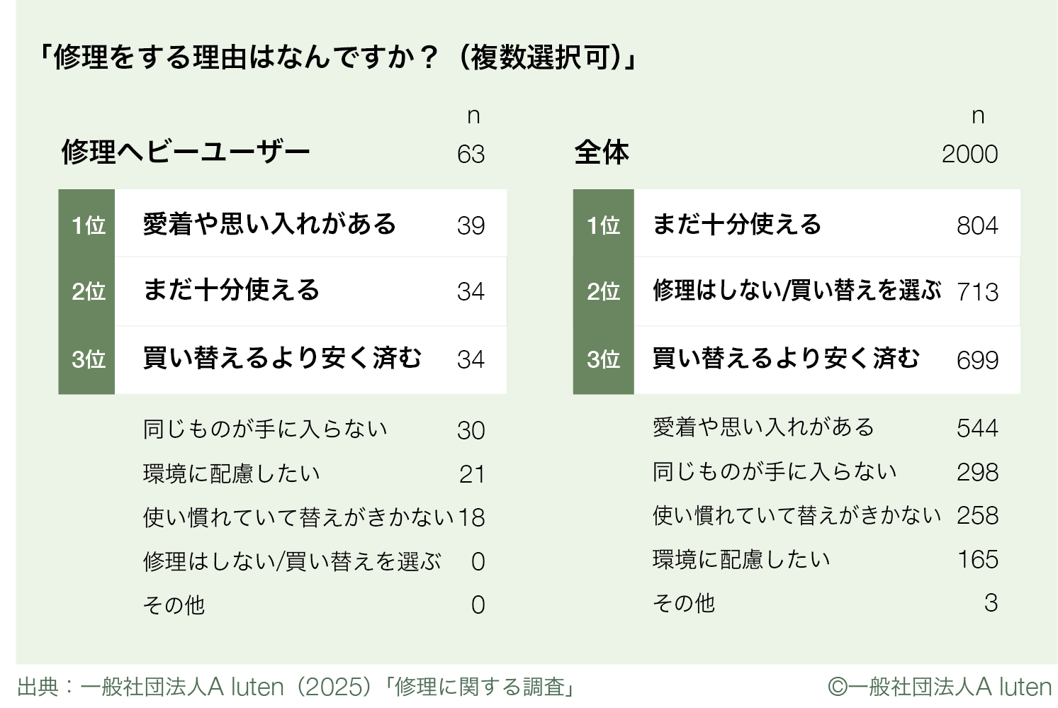 さらに注目したいのは、修理を選ぶ動機の違いです。調査全体では「まだ使えるから」という実用的・経済的な理由が最も多かったのに対し、ヘビーユーザーでは「愛着や思い入れがあるから」という感情的な理由が上位に挙がりました。