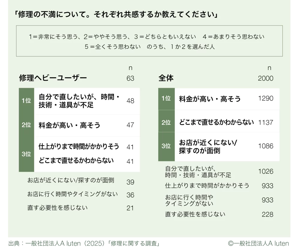 修理に関する不満や不安にも、両者で異なる傾向が見られました。調査全体では料金やアクセスの悪さを挙げる人が多い一方、ヘビーユーザーは「大切なものを自分では直せない」ことへの不満が目立ちます。ただし、料金や修理可能な範囲の見通しが立てにくい点は、両者に共通する課題です。