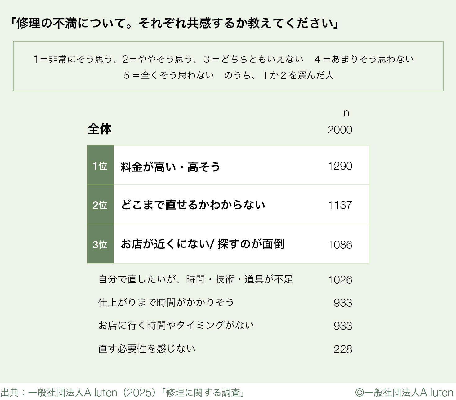 一方、「直す必要性を感じない」という項目は最も不満が少なく、多くの人が修理の必要性自体は認識していることがわかりました。