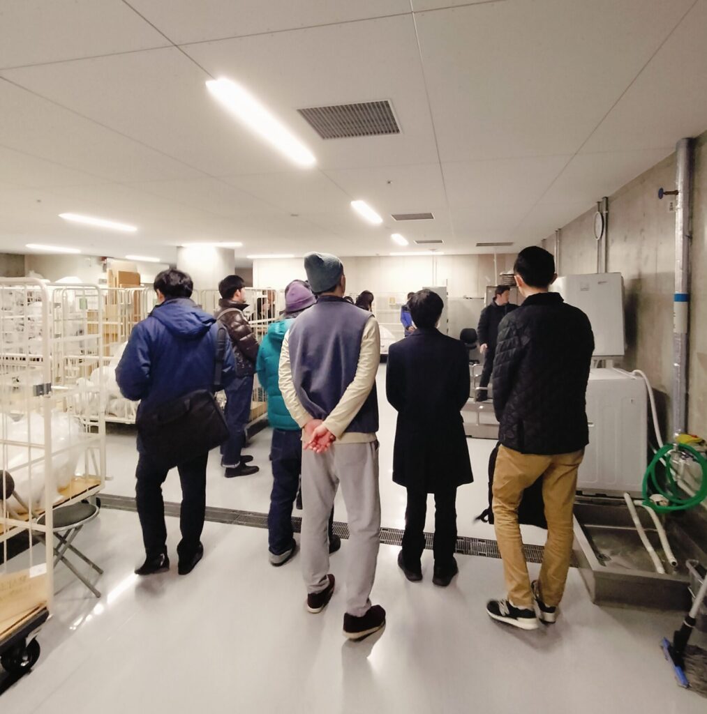 ワークショップは、天神の新設ビルワン・フクオカ・ビルディング(通称ワンビル)の資源庫見学からスタートしました。言わずと知れた、福岡の都心再開発プロジェクト天神ビッグバンの象徴的な建物のひとつです。ここでの目的は、商業施設における資源管理のリアルなオペレーションを理解すること。テナントから排出されるごみや資源物が、どのように集められ、分別され、そして再資源化へとつながっていくのか、その裏側の仕組みを実際の現場で確認しました。
